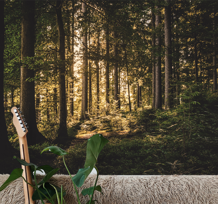 Numer referencyjny: F12045Spokojna leśna scena z wysokimi drzewami skąpanymi w złotym świetle słonecznym. Leśna podłoga jest bujna i zielona, tworząc serene atmosferę. Promienie słońca przenikają przez gęste liście, oświetlając ścieżkę, która wije się przez ten spokojny krajobraz.