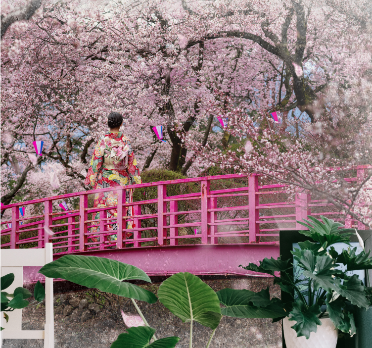 Numer referencyjny: F12031Spokojny obraz kwitnących wiśni, otaczający tradycyjną postać na różowym moście. Delikatne różowe kwiaty tworzą spokojną atmosferę, wzmocnioną kolorowymi dekoracjami wokół, ucieleśniając piękno natury i kultury.