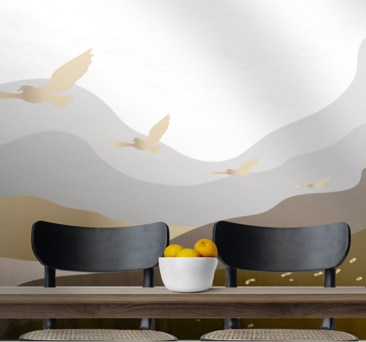Numer referencyjny: F12060Eleganckie sylwetki ptaków szybują nad falującymi wzgórzami i warstwowymi górami. Projekt pięknie uchwyca istotę natury, podkreślając spokojny krajobraz z prostymi formami i ziemistymi tonami. Harmonijne ułożenie sprzyja spokojnej atmosferze, zapraszając do kontaktu z przyrodą.