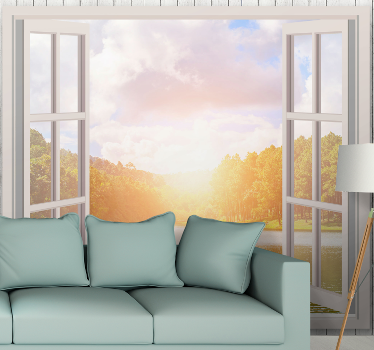 Odkryj Tapetya natura wschód słońca nad jeziorem, która przeniesie Cię w malowniczy krajobraz, gdzie okno na świat otwiera widok na piękny wschód słońca nad jeziorem. Wyjątkowa grafika przedstawia zachód słońca, majestatyczne drzewa i spokojny las, tworząc efekt trompe l'oeil, który zachwyci każdego miłośnika natury. Ten projekt wprowadza do wnętrza harmonię i spokój, idealnie komponując się z każdym pomieszczeniem.