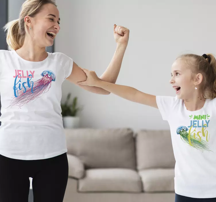 Numer referencyjny: T5235Ten żywy obraz przedstawia matkę i córkę dzielące radosne chwile, obie ubrane w pasujące bluzki z żywymi obrazami meduz. Zabawny design podkreśla ich więź i tworzy wesołą, kolorową atmosferę, idealną do wyrażania miłości i bliskości.