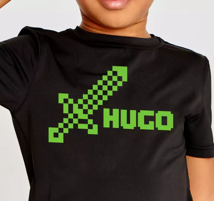 Numer referencyjny: T4921Ten żywy element zawiera pikselowy wzór miecza obok personalizowanej nazwy. Odważna zieleń na eleganckim czarnym tle tworzy uderzający efekt wizualny, idealny dla młodych entuzjastów gier. To zabawny, spersonalizowany dodatek do garderoby każdego dziecka.