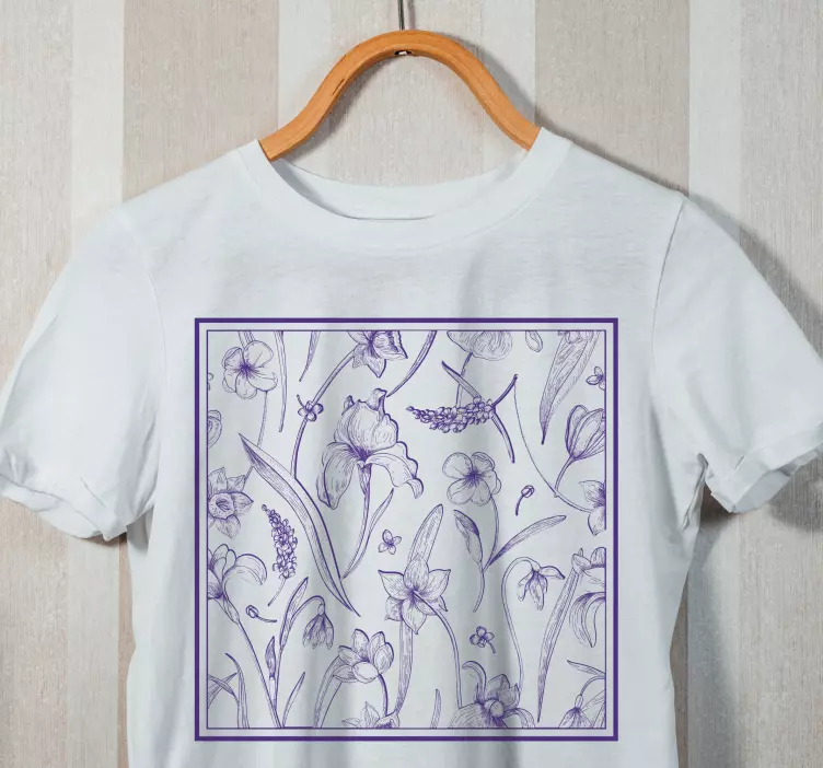 Koszulka z układem motywów botanicznych to wyjątkowy produkt, który zachwyca swoją grafiką przedstawiającą krokusy oraz inne kwiaty. Kwiatowy wzór w odcieniach fioletowego tworzy harmonijną kompozycję, przyciągając wzrok i dodając świeżości każdej stylizacji. Sztuka i ilustracja natury przenikają się w tym wzorze, tworząc niepowtarzalny botaniczny motyw, który sprawi, że każda chwila będzie pełna radości i wiosennego klimatu.