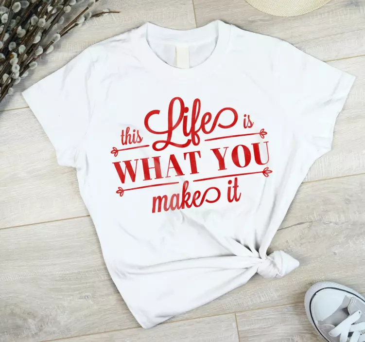 Numer referencyjny: T4937Ten projekt zawiera silny motywacyjny cytat, który podkreśla temat, że życie jest tym, co z niego uczynisz. Wyraziste litery i żywe kolory przyciągają uwagę, co czyni go doskonałym wyborem na codzienny strój, aby inspirować pozytywność.