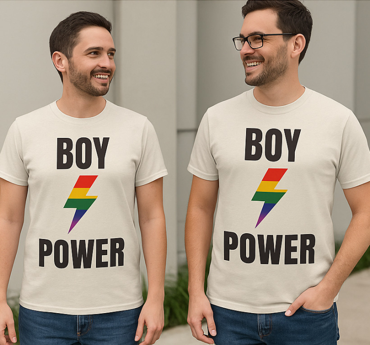Ten obrazek przedstawia dwóch modeli w pasujących koszulkach z wyraźnym napisem 'BOY POWER'. Każda koszulka ma kolorowy wzór błyskawicy, symbolizujący witalność i energię. Projekt podkreśla wsparcie dla dumy LGBTQ+, wyrażając przesłanie o empoderowaniu i jedności w stylu. Neutralne tło skutecznie uzupełnia koszulki.