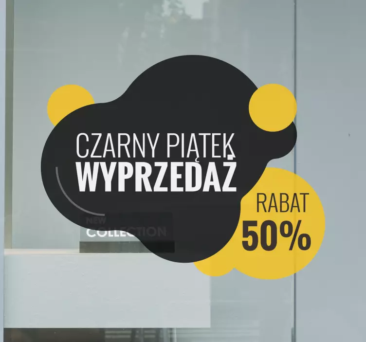 , która informuje klientów o dostępnych rabatach w Twoim sklepie. Projekt przedstawia nieregularną czarną figurę z białym tekstem w towarzystwie dwóch żółtych kulek. Nasze produkty są wykonane z najwyższą jakością, dzięki czemu możesz je przykleić na dowolną, gładką powierzchnię bez żadnych problemów, bez powstawania pęcherzyków ani zagnieceń. Co więcej, matowe wykończenie nie odbija światła w nieestetyczny sposób. Zamów tęnaklejkę Black Friday