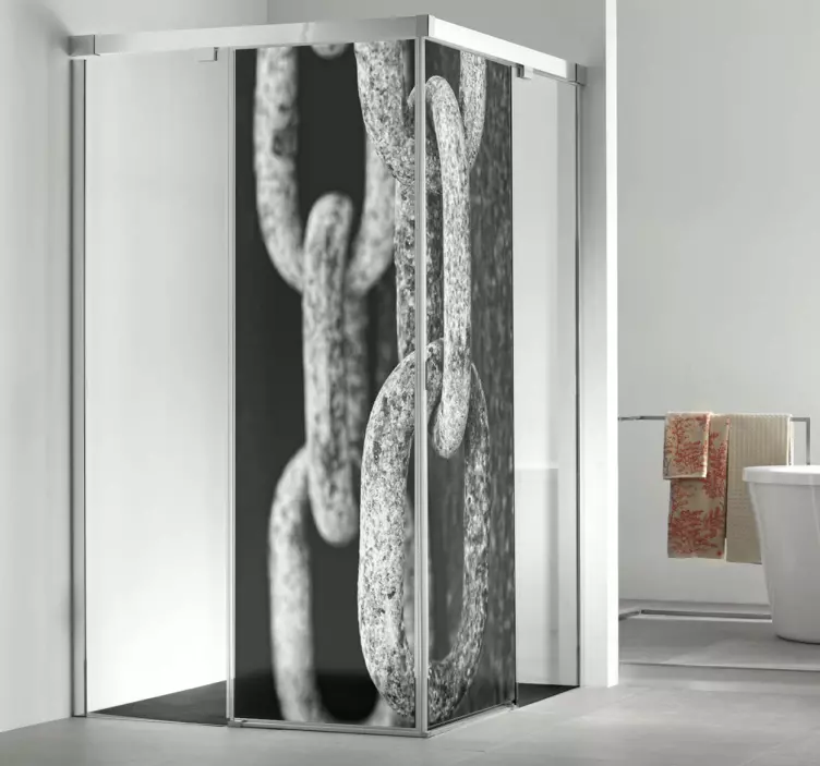 Naklejka fototapeta na ścianę, która przedstawia czarno biały łańcuch. Całość jest utrzymana w kolorach szarości, przeważa biel i czerń. Ozdoba na ścianę idealna zarówno do jasnych jak i ciemnych ścian, dzięki jednokolorowej grafice naklejka świetnie wkomponuje się w każdy rodzaj i kolor pomieszczenia. Naklejka na prysznic świetnie sprawdzi się w przypadku nowoczesnych pomieszczeń.