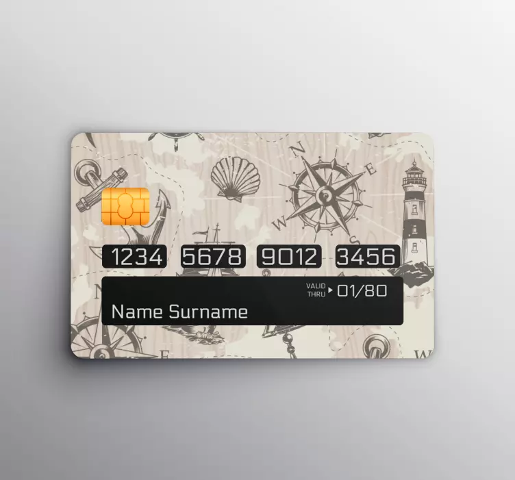 Przedstawiamy naklejkę na kartę w morskim stylu, która przeniesie Cię w świat nautycznych przygód. Nasz projekt graficzny charakteryzuje się piękną ilustracją przedstawiającą kotwicę, mapy, latarnię morską, muszlę oraz kompas, a całość otulona jest w motywy przypominające drewno. Dzięki temu każda karta kredytowa zyska wyjątkowy charakter i stanie się niepowtarzalnym dodatkiem do Twojego portfela!
