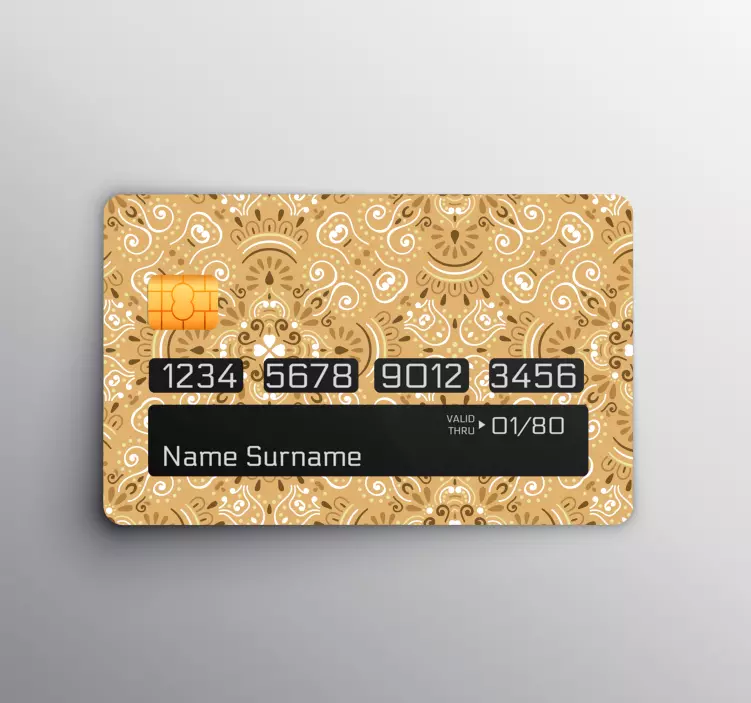 Odkryj naszą naklejkę na kartę wytworny wzór na karcie, która zachwyca eleganckim beżowym odcieniem i ozdobnym wzorem. Projekt graficzny tej naklejki na kartę kredytową został stworzony z myślą o osobach ceniących sobie dekoracyjny i elegancki styl. Dzięki starannie dobranym detalom, każda karta staje się nie tylko funkcjonalna, ale również modna!