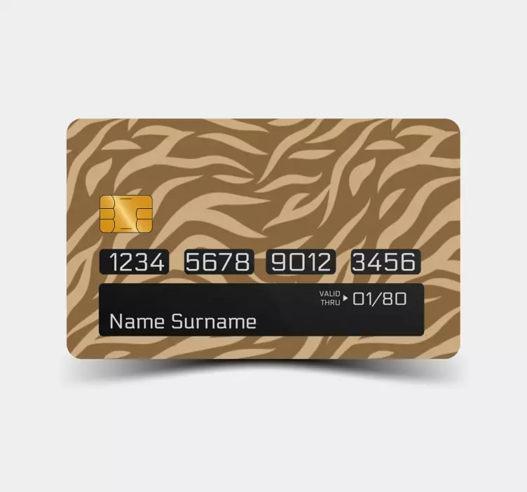 Nasza naklejka na kartę wzór dzikiej natury to prawdziwy hit dla miłośników przyrody! Projekt graficzny łączy w sobie niezwykłe motywy dzikiej natury, w tym majestatycznego tygrysa oraz wzory przypominające skórę różnych zwierząt, takich jak zebra. Kolory brązowe przeplatają się z abstrakcyjnymi wzorami, tworząc unikalny nadruk zwierzęcy, który z pewnością przyciągnie wzrok. Ta naklejka na kartę kredytową to idealny sposób na personalizację Twojej karty!