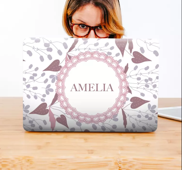 Numer referencyjny: A46579Urokliwy wzór kwiatowy z delikatnymi liśćmi i sercami, otaczający sekcję do personalizacji z imieniem. Ten elegancki design dodaje osobistego akcentu każdej powierzchni, zwiększając atrakcyjność estetyczną, jednocześnie pozwalając na indywidualność i kreatywność.