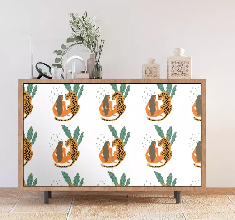 Przenieś się w egzotyczny świat, gdzie lampart spotyka kobietę w otoczeniu bujnych roślin. Nasza naklejka na meble scena z leopardem i roślinami to ręcznie rysowany motyw, który doda Twoim wnętrzom kapryśnego, tropikalnego charakteru! Dzięki starannemu wykonaniu, ten wzór przyciąga wzrok i inspiruje do tworzenia unikalnych przestrzeni. Natura i motywy zwierzęce splatają się w harmonijną całość, a każdy detal jest dopracowany z najwyższą starannością.