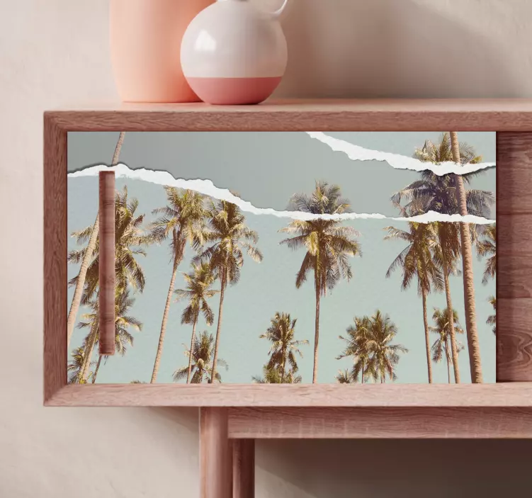 Odkryj wyjątkowy projekt graficzny naszej naklejki na meble tropikalny widok palm, który przeniesie Cię do rajskiego zakątka, gdzie majestatyczne drzewa palmowe i soczysta zieleń tworzą niezapomniany widok! Ta naklejka imituje rozdarty i podarty papier, dodając Twoim meblom niepowtarzalnego charakteru i stylu. Wprowadź do swojego domu atmosferę spokoju i harmonii z naturą, dzięki naszej naklejce na meble.