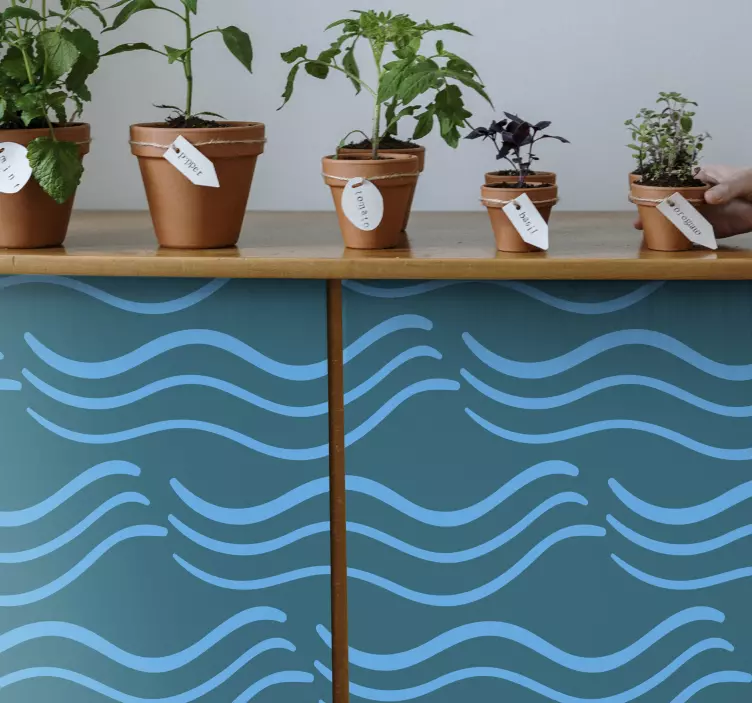 Przygotuj się na prawdziwą rewolucję w dekoracji swojego wnętrza z naszą naklejką na meble w płynne wzory w odcieniach aqua! Ten wyjątkowy projekt graficzny łączy w sobie harmonijnie faliste linie i dynamiczne fale, które w połączeniu z intensywnym niebieskim kolorem wpasują się w każdy styl wnętrza. Dodatkowo, elementy roślinne i motywy garnków wprowadzą do Twojego domu świeżość i naturalność, tworząc niepowtarzalną atmosferę.
