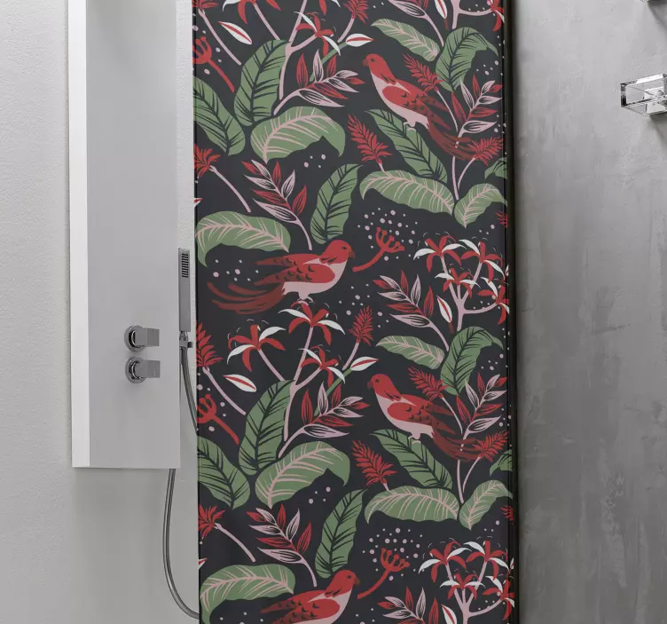 Odkryj niezwykłą naklejkę na prysznic z motywem ptaków botanicznych, która wprowadzi do Twojej łazienki niepowtarzalny klimat. Grafika przedstawia wibrujące ptaki otoczone liśćmi oraz kwiatowym wzorem, co sprawia, że poczujesz się jak w sercu natury. Dominujące odcienie zieleni i czerwieni nadają całości świeżości i życia, a ekran prysznicowy z pewnością przyciągnie uwagę każdego!