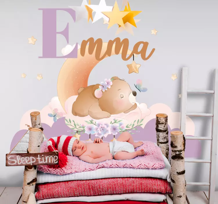 Numer referencyjny: A52394Urokliwy obrazek przedstawiający śpiącego niedźwiedzia wśród chmur i gwiazd. Projekt zawiera pastelowe kolory, kwiatowe akcenty oraz spersonalizowane elementy, idealne do pokoju dziecka. Spokojna tematyka sprzyja relaksowi, co czyni go doskonałym do żłobków lub pokoi dziecięcych.