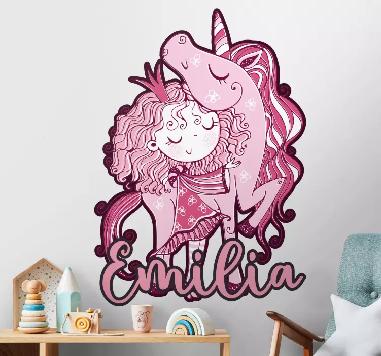 Numer referencyjny: A49490Ten uroczy projekt przedstawia młodą dziewczynkę ubraną w zabawny strój, przytulającą żywego jednorożca. Obie postacie otoczone są ciepłą paletą kolorów, tworząc bajkową atmosferę idealną dla dziecięcych wnętrz. Element do personalizacji pozwala na dodanie osobistych akcentów, które podkreślają jego wyjątkowość.