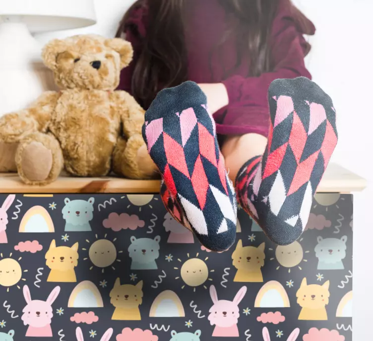 Zabawny design z różnorodnymi uroczymi postaciami zwierząt, wesołymi chmurkami i słońcami. Połączenie pastelowych kolorów i fantazyjnych elementów sprawia, że jest to idealny wybór do przestrzeni dla dzieci, tworząc radosną i zapraszającą atmosferę.
