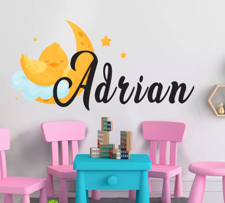 Nasza naklejka na ścianę dla dzieci w uroczy wzór księżyca to idealny sposób na wprowadzenie magii do pokoju Twojego malucha! Zawiera urocze pisklęta, które w towarzystwie księżyca i gwiazd tworzą przytulną atmosferę spania. Personalizowana nazwa dodaje wyjątkowego charakteru, a konfigurowalne elementy sprawiają, że każdy pokój dziecięcy staje się unikalny. Wzór wzbogacony o chmury umili każdą chwilę spędzoną w sypialni niemowlęcia!