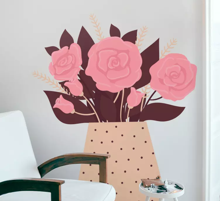 Numer referencyjny: A48128Piękna kompozycja kwiatowa z różowymi różami ułożonymi w wazonie w kropki. Ten projekt dodaje elegancji każdemu wnętrzu, celebrując naturalne piękno kwiatów i tworząc ciepłą oraz przytulną atmosferę.