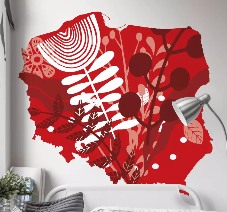 Ta dekoracyjna naklejka ścienna przedstawiająca Polskę Ludową jest idealna do ozdabiania wnętrz. Projekt roślin ozdobnych pokryty jest przezroczystym czerwonym malowaniem tworzącym mapę Polski. Naklejka może być naniesiona na dowolną płaską powierzchnię. Wybierz naklejkę z mapą Polski w dowolnym odpowiednim rozmiarze, idealnym do miejsca, w którym ma zostać nałożona. Łatwo się aplikuje, a po nałożeniu nie tworzy pęcherzy powietrza ani zmarszczeń na powierzchni. Podobnie jak wszystkie nasze produkty, jest wykonana z wysokiej jakości materiałów winylowego i nie nadaje połysku ani połysku.