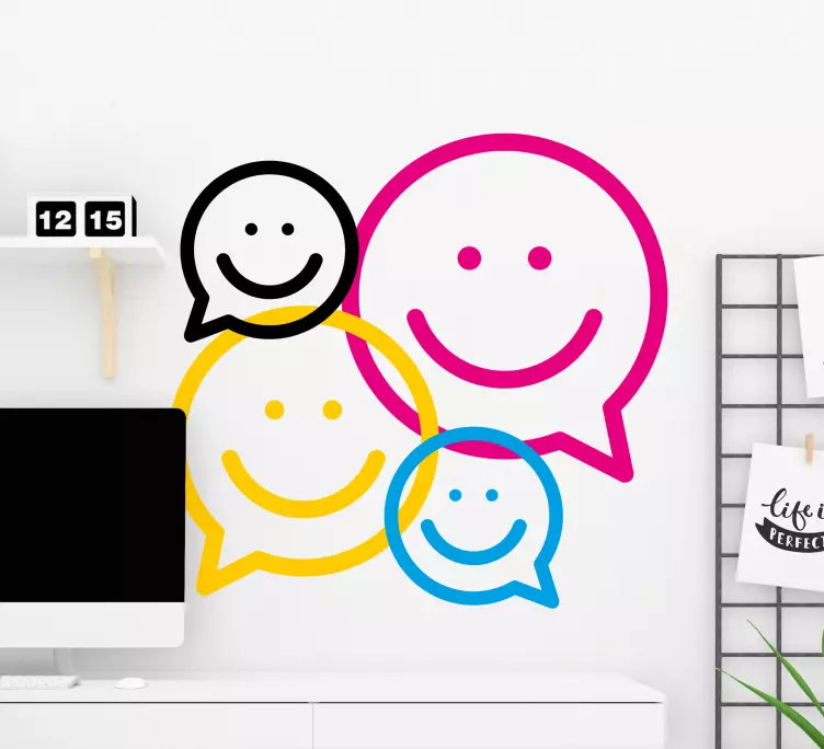 Numer referencyjny: A49042Zabawna aranżacja emotikon w różnych rozmiarach i kolorach reprezentuje radość i komunikację. Te radosne ikony, stylizowane z dymkami, wywołują emocje i tworzą żywą atmosferę, idealną dla przestrzeni, które mają na celu inspirowanie pozytywności.