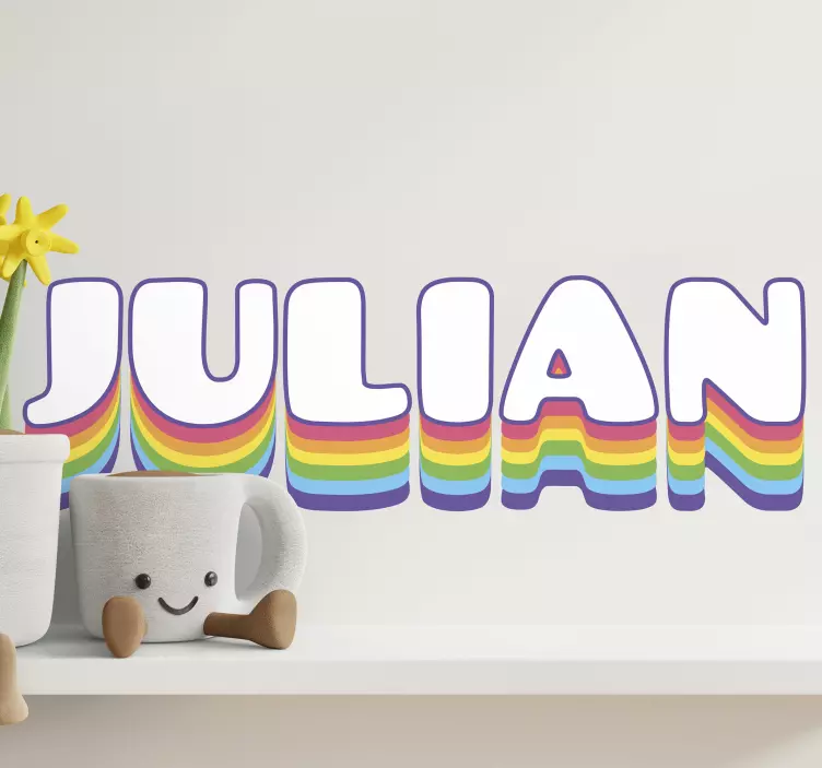 Numer referencyjny: A47266Ten kolorowy projekt nazwy charakteryzuje się radosnym, żywym efektem tęczy w całych literach. Każdy znak płynnie integruje spektrum, tworząc przyjemną atmosferę. Idealny do personalizacji przestrzeni dziecka, dodaje wesołego akcentu, jednocześnie pozwalając na dostosowanie do indywidualności.