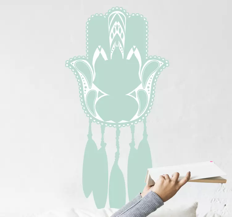Odkryj niezwykłą naklejkę na ścianę ornament emblemat roślinny, która wprowadzi do Twojego wnętrza wyjątkową harmonię i elegancję! Ten artystyczny projekt łączy w sobie elementy natury, takie jak łapacz snów, ręka oraz kwiatowy motyw, tworząc unikalną kompozycję w odcieniach turkusu. Wykonany z dbałością o detale, nasz ornament podkreśli charakter każdego pomieszczenia, dodając mu wyjątkowego stylu.