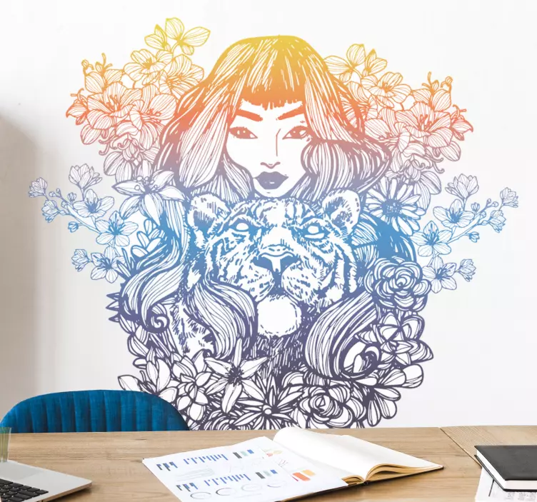 Naklejka na ścianę postacie kobieta z tygrysem to wyjątkowy projekt łączący w sobie elementy celtyckie oraz odważne kolory. W centralnym punkcie grafiki znajduje się kobieta towarzysząca majestatycznemu tygrysowi, otoczona kwiatami, co nadaje całej kompozycji wyjątkowego charakteru. Rysunek wykonany w formie grafiki liniowej z gradientem sprawia, że każda ściana, na której znajdzie się ta naklejka, zyska nowy, artystyczny wyraz!