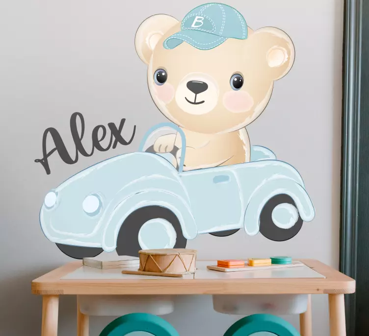 Numer referencyjny: A48719Urokliwa ilustracja przedstawia urocze niedźwiedzia w vintage'owym pojeździe, noszącego czapkę. Projekt budzi poczucie zabawy i przygody, przyciągając wyobraźnię dzieci. Opcje personalizacji dodają wyjątkowego akcentu, czyniąc to wspaniałym dodatkiem do przestrzeni każdego dziecka.