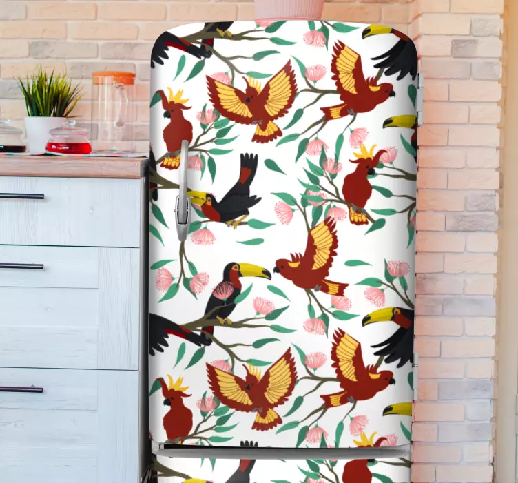 Witamy w świecie barw i uroku! Nasza naklejka na ścianę ptaki tropikalne motywy to wspaniała dekoracja, która przeniesie Cię w serce tropików. Grafika przedstawia wibrujące papugi i tukany otoczone bujną roślinnością, które dodadzą Twoim wnętrzom niepowtarzalnego charakteru. Kolorowe wzory oraz kwiatowe motywy sprawiają, że każdy dzień staje się radosny i pełen życia!