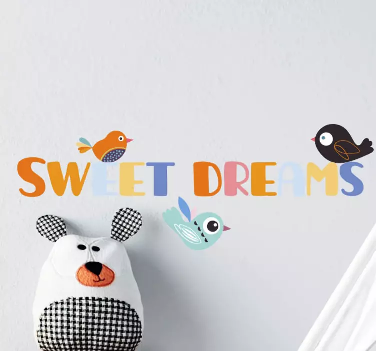 Numer referencyjny: A51016Żywy pokaz z radosnymi ptakami zdobiącymi fantazyjną frazę, która przekazuje przesłanie spokojnego snu. Idealne do rozjaśnienia przestrzeni dziecka, połączenie kolorów i postaci dodaje zabawny akcent do każdego pokoju.