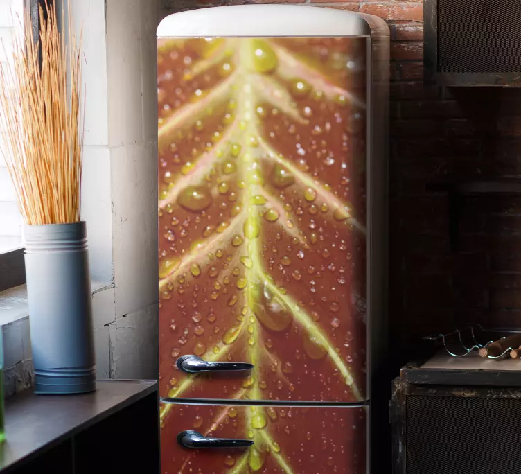 Odkryj niezwykłą okleinę na lodówkę kropelki wody na liściach, która przenosi Cię w sam środek natury! Ten wyjątkowy projekt zdobi lodówkę grafiką przedstawiającą liście maranty pokryte delikatnymi kroplami wody, co tworzy niepowtarzalny, kwiatowy klimat. Zachwyć się zielonymi odcieniami i teksturą, która ożywia Twoją kuchnię, wprowadzając do niej świeżość i harmonię!