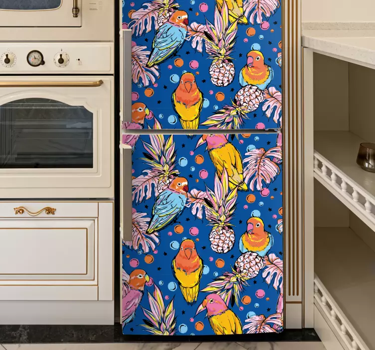 Nasza okleina na lodówkę w kolorowe papugi to prawdziwa uczta dla oczu! Zjawiskowy projekt przedstawia ptaki oraz papugi, które wspaniale harmonizują z ananasy i innymi tropikalnymi elementami. Całość utrzymana jest w żywych kolorach, które doskonale oddają klimat Natury. Dzięki temu, każda lodówka stanie się wyjątkowym elementem wystroju Twojego wnętrza!