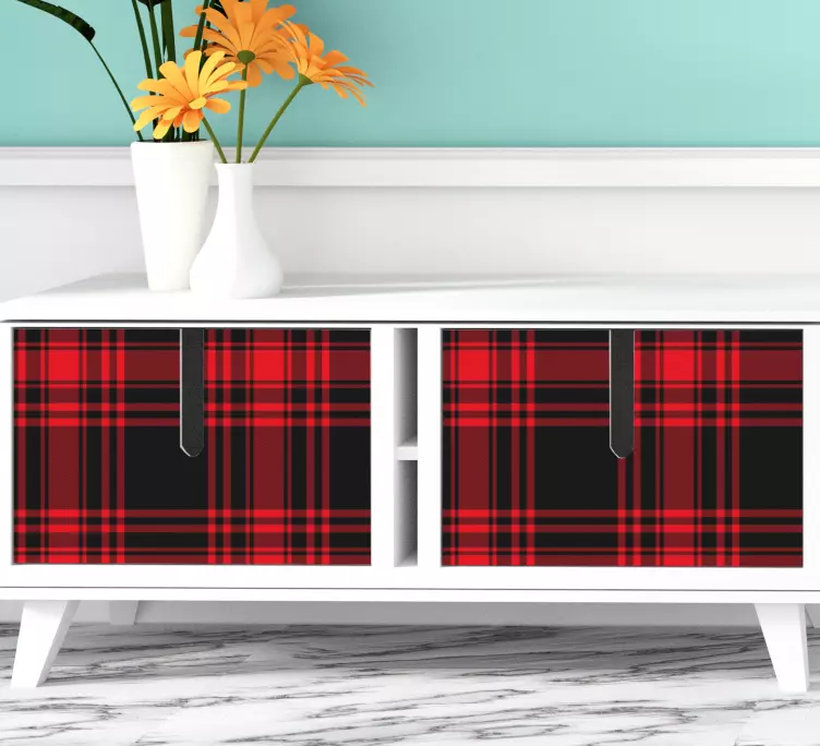 , instalując tęniesamowitą naklejkę meblową Menzies w kratę w czarno-czerwoną kratkę