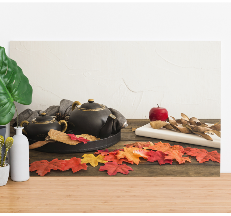 Obraz krajobrazy jesienna aranżacja herbaty to wyjątkowe połączenie piękna natury i rustykalnego stylu. Na tym zachwycającym dziele graficznym możemy dostrzec czajniki oraz czajniczek otoczone przez jesienne liście, które tworzą wspaniałą martwą naturę. Tablica z jabłkiem dodaje całości ciepłego, przytulnego charakteru, idealnie wpisując się w atmosferę jesiennego relaksu przy filiżance herbaty. To piękne dzieło sztuki z pewnością ożywi każde wnętrze, nadając mu niepowtarzalny klimat!