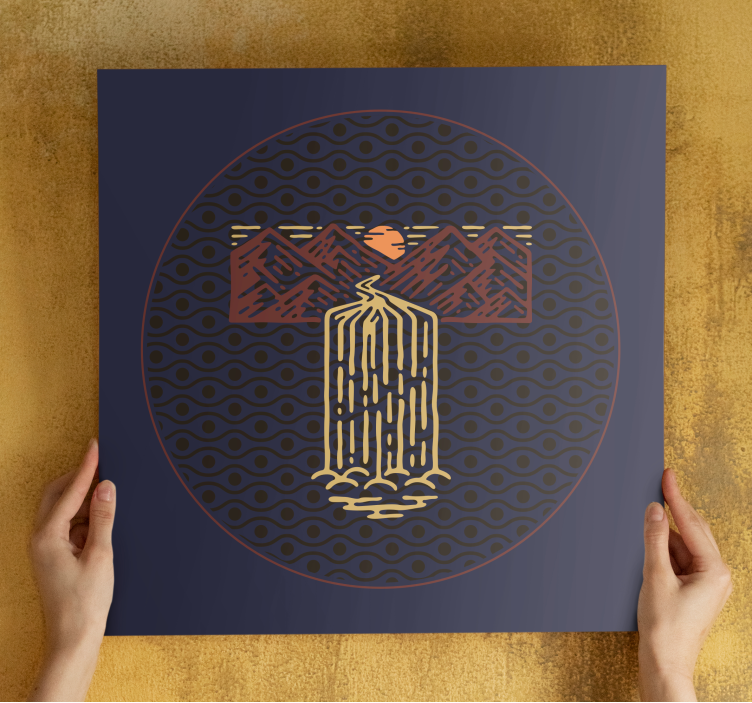 Numer referencyjny: Q7828Uspokajająca kompozycja przedstawiająca wodospad spadający wśród stylizowanych górskich szczytów i zachodzącego słońca. Okrągły kształt dodaje harmonii, podczas gdy skomplikowane linie wywołują poczucie spokoju i połączenia z naturalnym światem.
