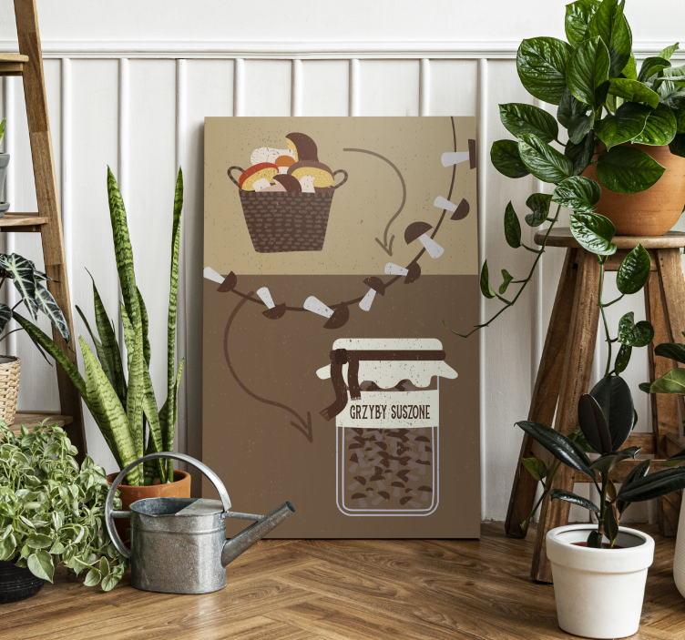 Ręcznie rysowany w kolorze brązowym i beżowym, obraz dodaje uroku Twojej kuchni. Przedstawia instrukcję suszenia grzybów i ich przechowywania. Jest to produkt oryginalny, wykonany z wysokiej jakości materiałów, bardzo trwały i odporny.