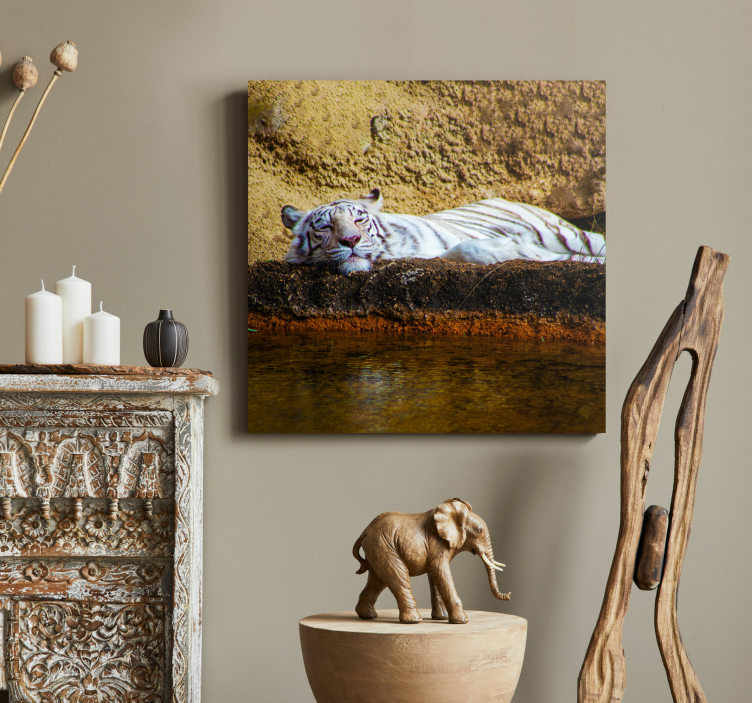 Numer referencyjny: Q6655Spokojny moment uchwycony z białym tygrysem wylegującym się przy wodzie, ukazującym swoje spokojne usposobienie. Tygrys leży na teksturowanym tle, podkreślając swoje charakterystyczne paski i spokojny wyraz, otoczony naturalnymi elementami, które wzbogacają scenę.