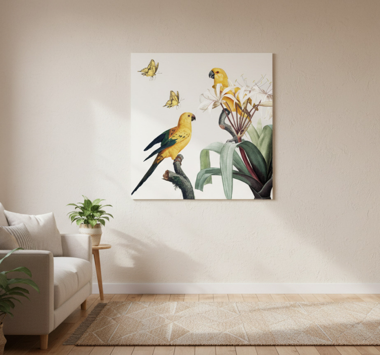 Plakat do salonu papugi z żółtymi kwiatami i motylami