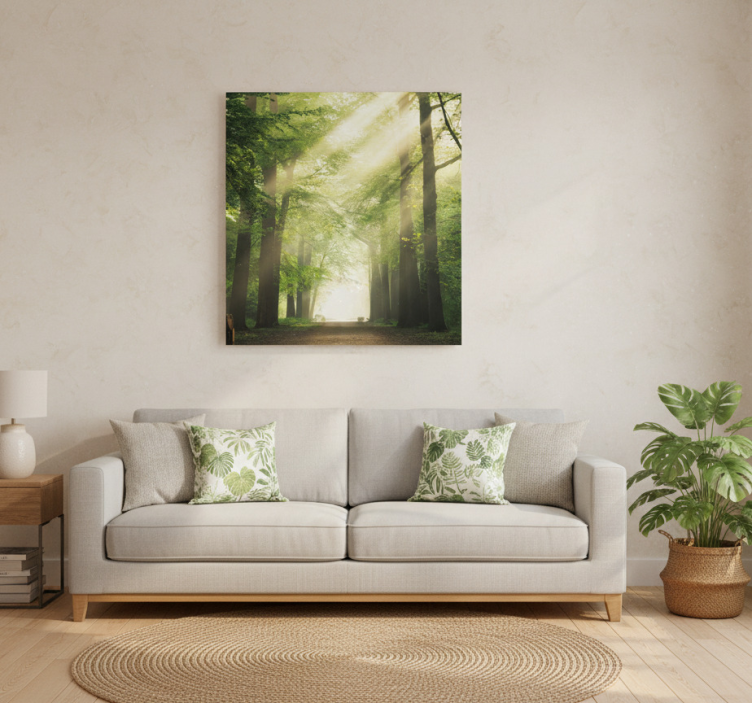 Plakat do salonu zielony las z promieniami słońca