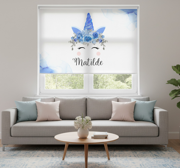 Biała roleta z uroczymi oczami i rogami jednorożca