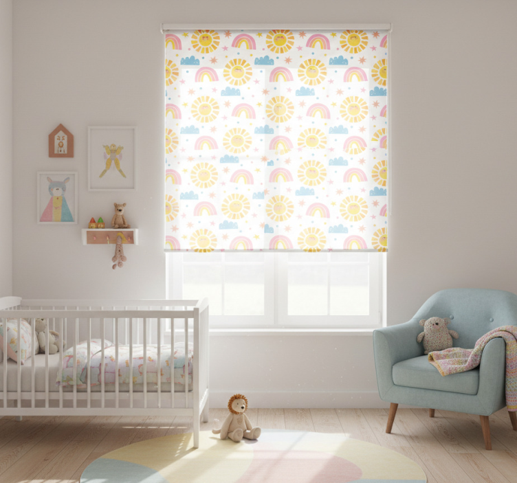 Roleta dla dzieci tęcza, słońca i chmury na białym tle