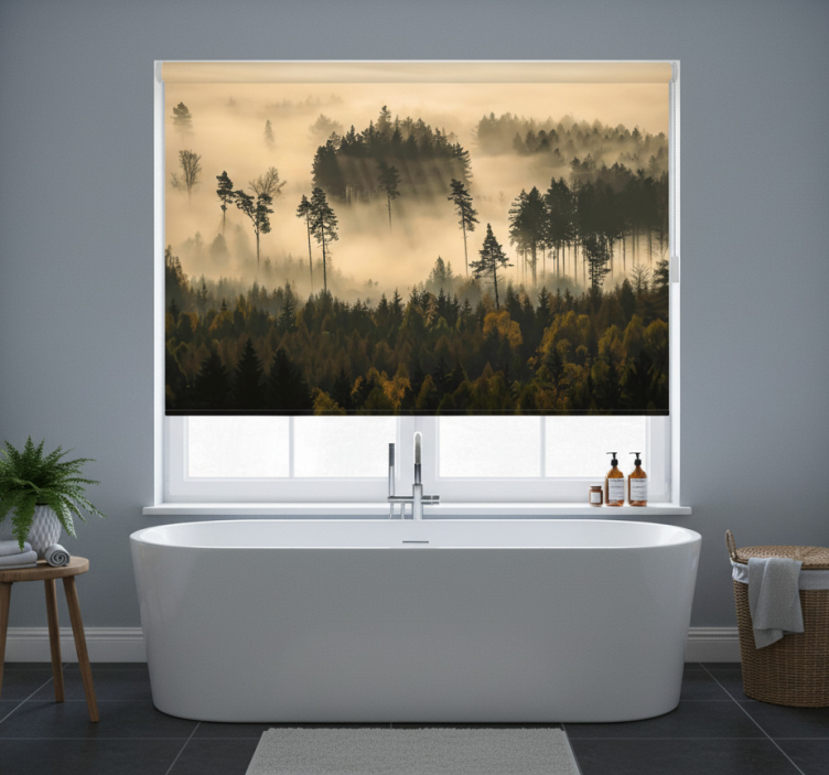 Roleta z drzewami w eterycznej porannej mgle