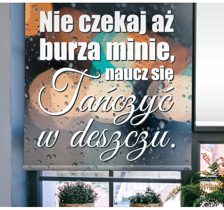 Mozaikowe tło rolety przedstawia krople deszczu, tworząc wrażenie romantycznego deszczowego dnia. Duży biały tekst na rolety motywuje do tańca w deszczu.
