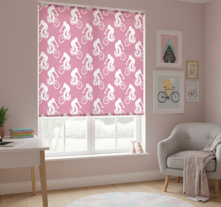 Różowa roleta z białym wzorem rowerzystów