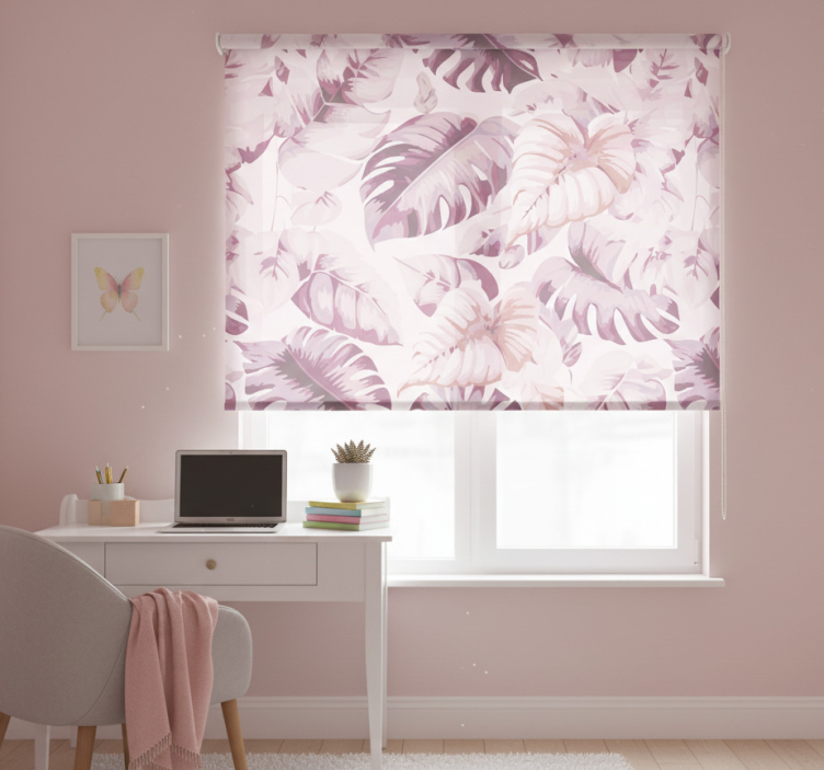 Różowa roleta z dużymi tropikalnymi liśćmi