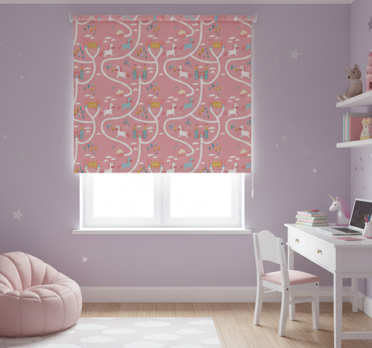 Różowa roleta z zamkami i jednorożcami